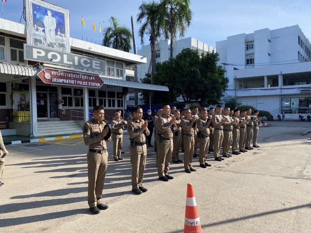 วันที่ 25 ตุลาคม 2567 เวลา 08.00 น. พ.ต.อ.มนตรี ชูยิ่ง รรท.ผกก.สภ.อรัญประเทศ นำข้าราชการตำรวจ สภ.อรัญประเทศ ที่ปฏิบัติหน้าที่บนสถานี และเจ้าหน้าที่สายตรวจผลัดเข้าและออกจากการปฏิบัติหน้าที่ เคารพธงชาติ สวดมนต์ไหว้พระ กล่าวคำปฏิญาณ และมอบนโยบาย