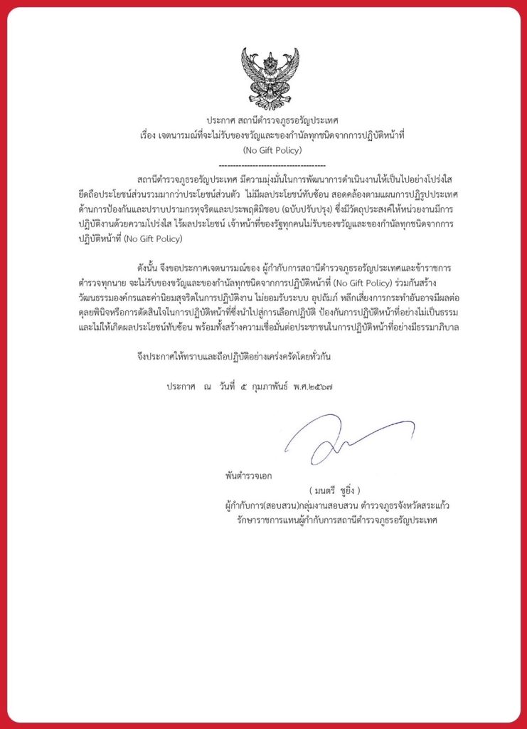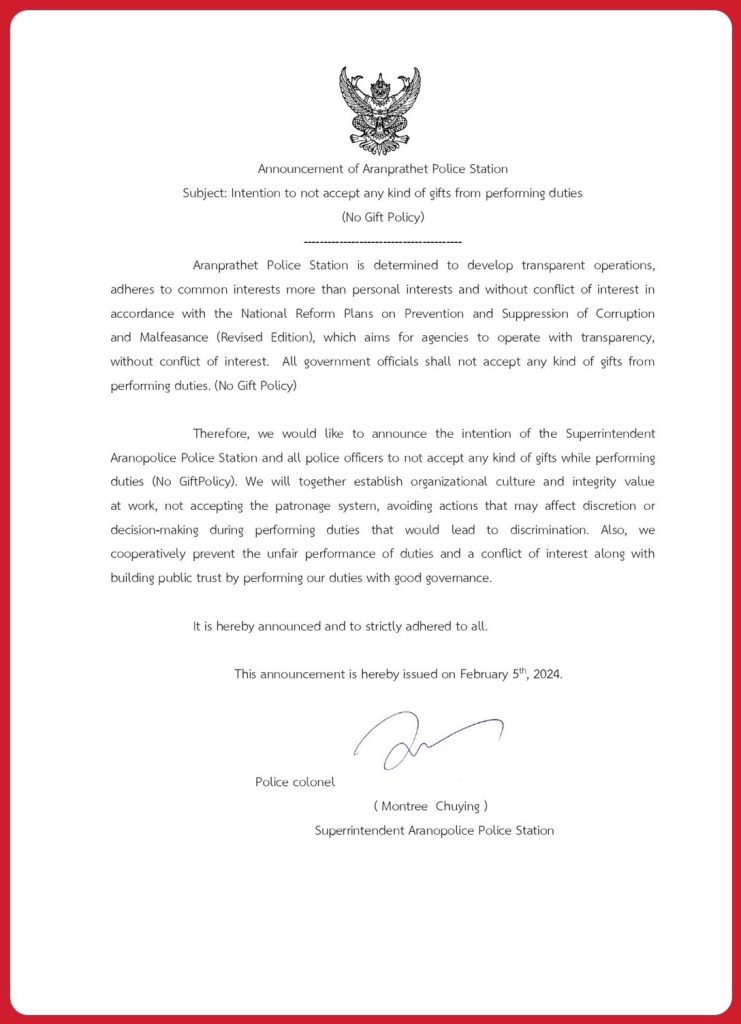 ดังนั้น จึงขอประกาศเจตนารมณ์ของ ผู้กำกับการสถานีตำรวจภูธรอรัญประเทศและข้าราชการตำรวจทุกนาย จะไม่รับของขวัญและของกำนัลทุกชนิดจากการปฏิบัติหน้าที่ (No Gift Policy) ร่วมกันสร้างวัฒนธรรมองค์กรและค่านิยมสุจริตในการปฏิบัติงาน ไม่ยอมรับระบบ อุปถัมภ์ หลีกเสี่ยงการกระทำอันอาจมีผลต่อดุลยพินิจหรือการตัดสินใจในการปฏิบัติหน้าที่ซึ่งนำไปสู่การเลือกปฏิบัติ ป้องกันการปฏิบัติหน้าที่อย่างไม่เป็นธรรม และไม่ให้เกิดผลประโยชน์ทับซ้อน พร้อมทั้งสร้างความเชื่อมั่นต่อประชาชนในการปฏิบัติหน้าที่อย่างมีธรรมาภิบาล