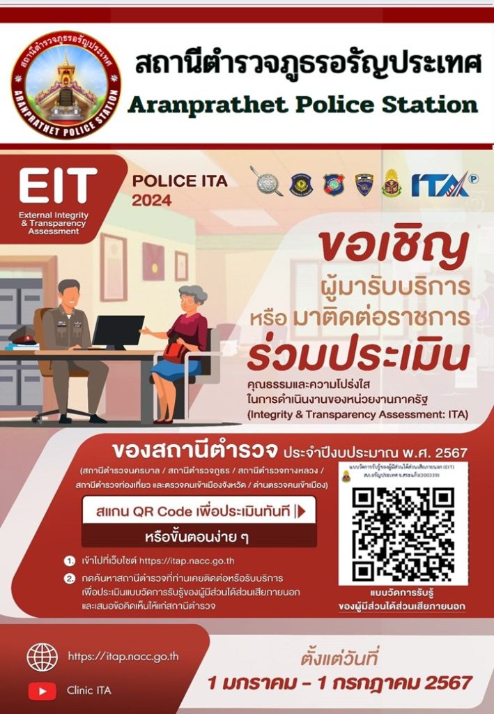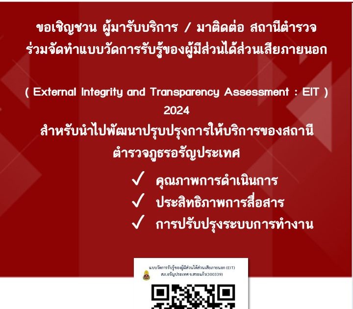 สภ.อรัญประเทศ ขอเชิญชวนผู้มารับบริการ / มาติดต่อสถานีตำรวจ ร่วมจัดทำแบบวัดการรับรู้ของผู้มีส่วนได้ส่วนเสียภายนอก(External Integrity & Transparency Assessment: EIT) 2024สำหรับนำไปพัฒนาปรับปรุงการให้บริการของสถานีตำรวจ
