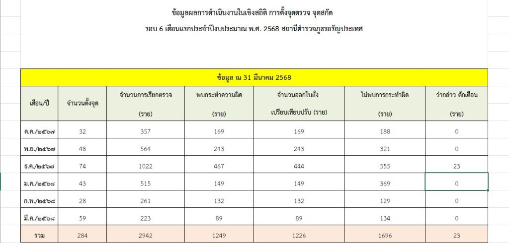 ข้อมูลผลการดำเนินงานเชิงสถิติในการตั้งจุดตรวจจุดสกัด เดือนมีนาคม 2568