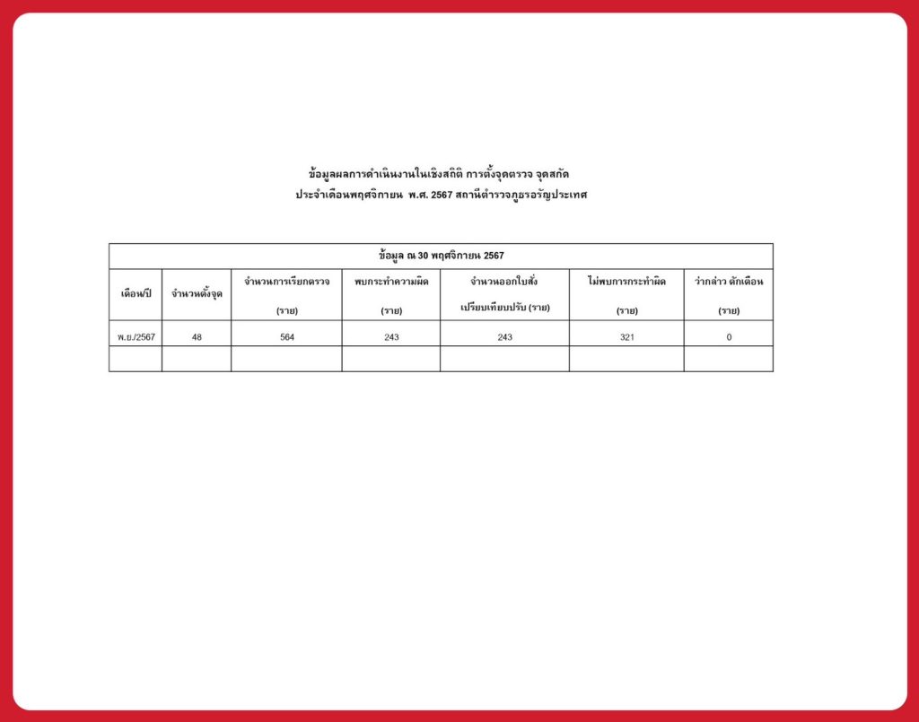 ข้อมูลผลการดำเนินงานเชิงสถิติในการตั้งจุดตรวจจุดสกัด เดือนพฤศจิกายน 2567